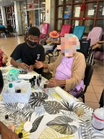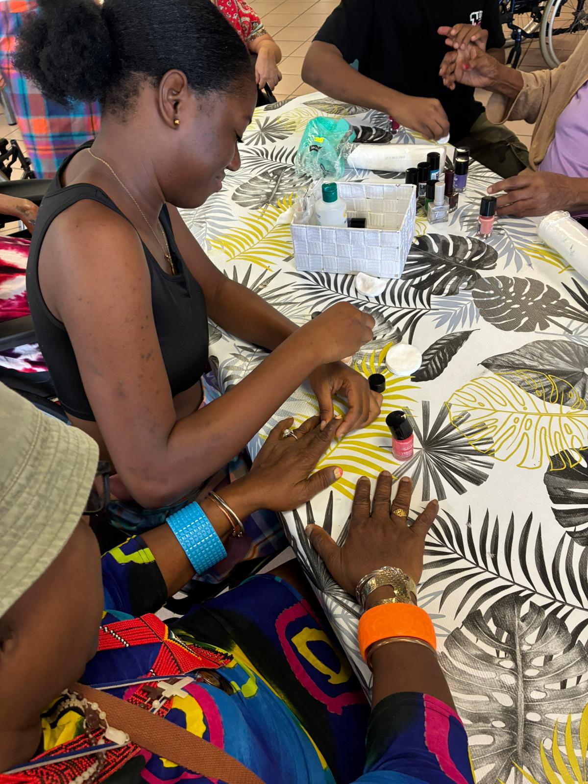 Après cette partie culturelle, place au self-care : les élèves ont réalisé des manucures aux résidents, pendant que d’autres profitaient de parties de dominos ou de Ludo.
